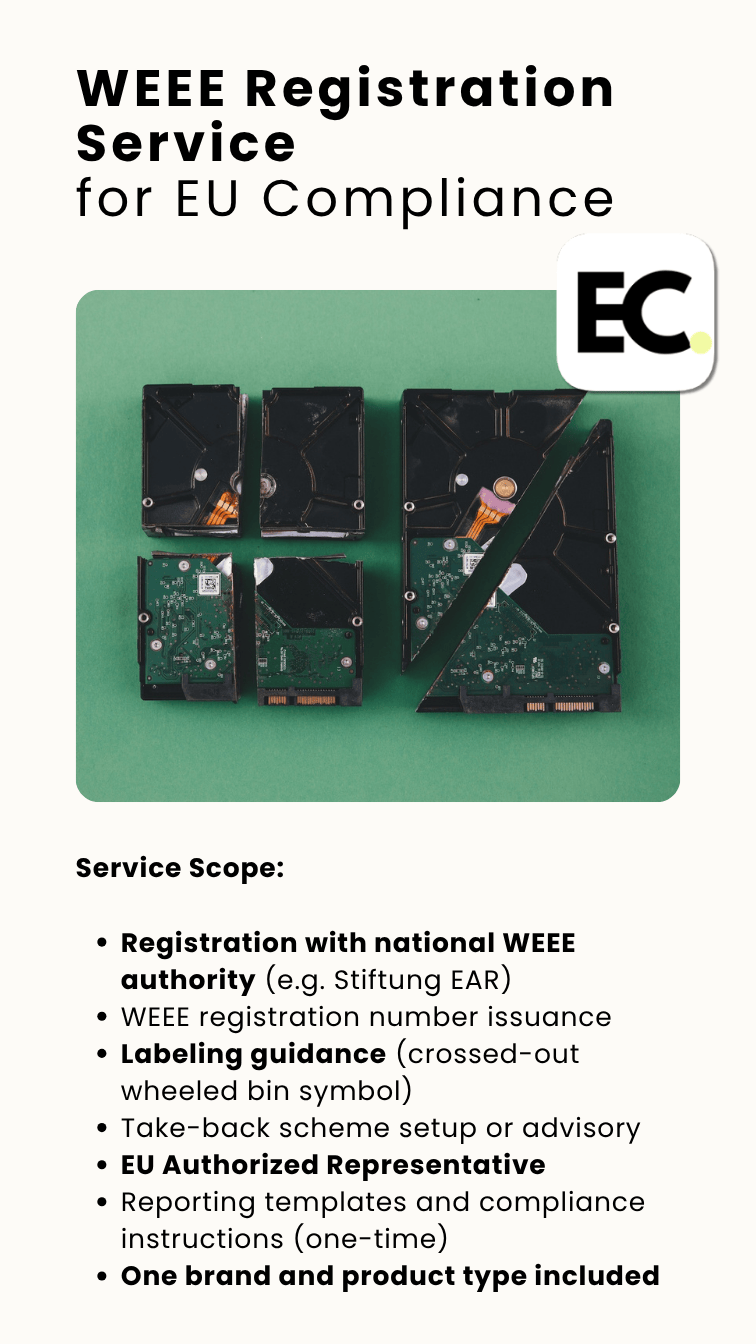 A complete, one-time compliance solution for businesses selling electrical and electronic equipment (EEE) in the European Union. Fully aligned with the WEEE Directive (2012/19/EU). No subscriptions. No renewals. No hidden fees. One service – full compliance.
